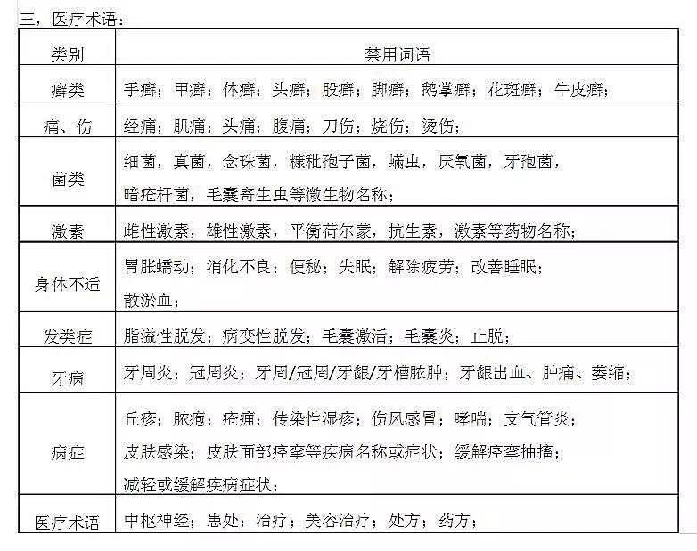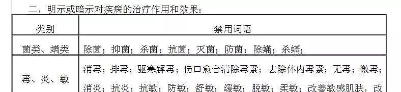 不得夸張宣傳產(chǎn)品效果、虛假效果;禁止明示或暗示對疾病的治療作用和效果(包括菌類、螨類、毒、炎、敏、保健類、內(nèi)調(diào)、班類等);禁止使用醫(yī)療術(shù)語(廯類、痛、傷、激素、身體不適、發(fā)類癥等)。